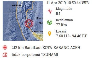 “Gempa Mag: 5.1, 11-Apr-19 10:50:44 WIB, Lok:7.60 LU,94.46 BT (212 km Barat Laut Kota Sabang-Aceh). Kedalaman: 77 Km, tidak berpotensi tsunami,” tulis @infoBMKG, akun twitter resmi BMKG, Kamis (7/4/2019).