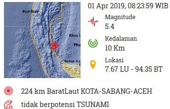 “Gempa Mag:5.4, 01-Apr-19 08:23:59 WIB, Lok:7.67 LU,94.35 BT (224 km Barat Laut Kota Sabang-Aceh), Kedalaman: 10 Km. Tidak berpotensi tsunami,” tulis @infoBMKG akun twitter resmi BMKG, Senin (1/4/2019).
